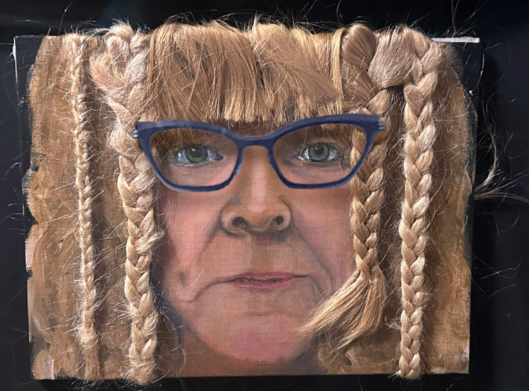 So what does all of this have to do with my new art project? Well, as you can see below, I decided to center my new piece around my own face and my own hair. And just for the fun of it I used Photoshop to add my glasses to it, as many may not recognise me without them! The glasses are not present in the original that now hangs on my wall. One visitor stared at my eyes for a long time and complimented me on the life-like eyes and the stare. That compliment was received in gratitude. It was an astute observation: I always pay special attention to eyes in my paintings, whether human or animal. So: I present to you: my self portrait with multi generational real hair!