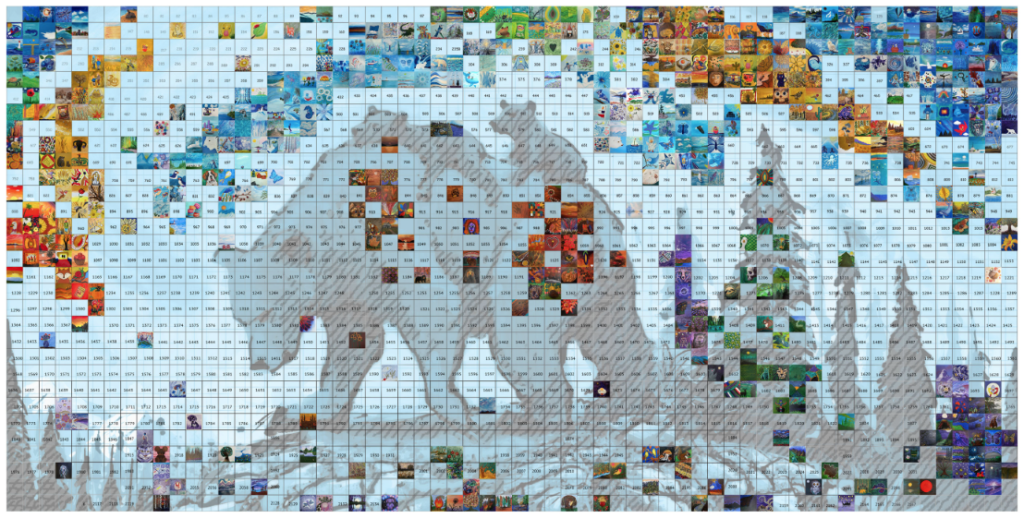 The way it works is that artists, or really anybody who wants to contribute creatively, can buy 1 or more spots on a future artwork. It is a great project for schools and community organisations as well. I bought 3 panels and was assigned the green, blue and golden pallet. The size of the panel was only 6×6″, much smaller than what I usually paint on. It took my brain a while to figure out what images to create. The panel comes with a cute mini stand, small containers with the colours to use and two brushes. I chose to use my own materials though.