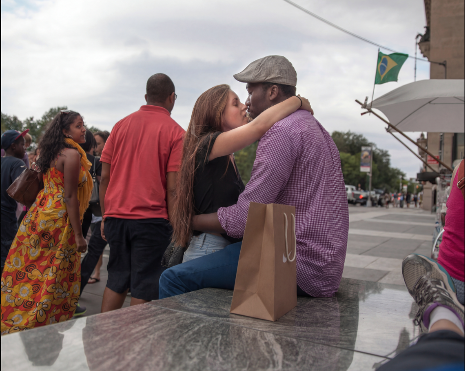 If there is one city on earth that lovers gravitate to it is of course New York. I am not a peeping Tom and a kissing couple is not something I tend to photograph. But what made this scene different was the young Asian lady in the orange dress. When she entered the scene I was instantly interested. She was the only passer-by who seemed to notice the couple and she shot them a direct look. I cannot fathom what she was thinking. Was she secretly yearning for a romantic embrace herself? Did she disapprove of all this passion displayed for all to see? Did she wish that SHE was in the arms of the boy? Who knows! To me, she was the center of the story in this photograph.