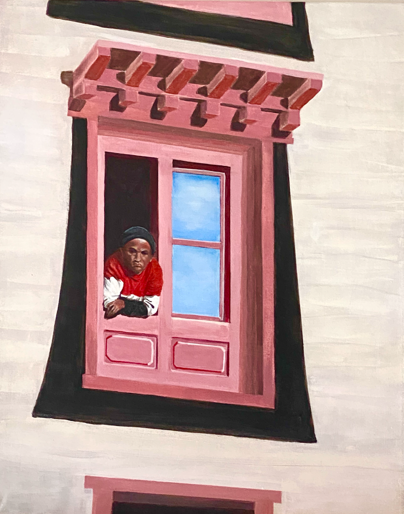 When I went for a walk with my camera, I was able to capture a shot from afar of the monks hanging out of the windows, observing us. It was not a clear picture, but good enough to use as the basis for a painting. As the painting developed, the monk turned out as a moody character…