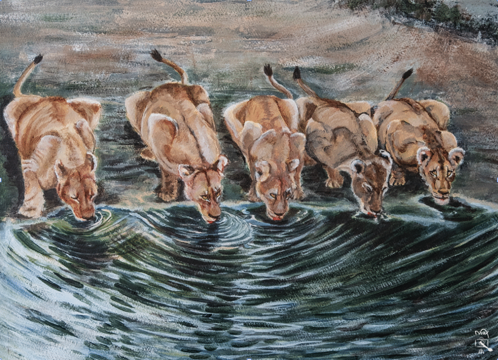 When the females are done hunting and have eaten their fill, they often move to a body of water to drink as a group. It is when quenching their thirst that these animals are most vulnerable. After all, their heads are practically in the water, and even with their ears turning in all directions, they are blind to most of what is happening behind their backs. This is why there is always ONE female feline that plays the role of the look-out. You can easily spot her in my painting, because she is the only one looking right at you…