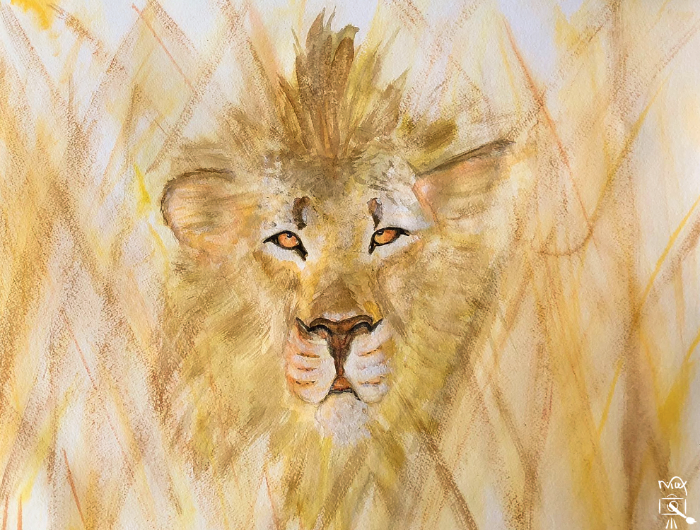 For instance… did you know that the colour of the coat of a lion changes depending on where they live? Which means that in the yellow grasses of the savannah, their coat is a light dun shade. Whereas when they live in more heavily forested areas, their coat is a lot darker. It is all for the benefit of camouflage. Lions in open grass fields lie dead still, whilst stalking a prey. The prey, provided the lions are downwind of them, has no idea that danger is lurking. The lions, from afar, look like clumps of grass or rocks. That is what the above watercolour painting is depicting. This young lion is simply staring at his prey until they come within reach. Which can be a mere yard from where he is and chances are that he will bring home fresh dinner!